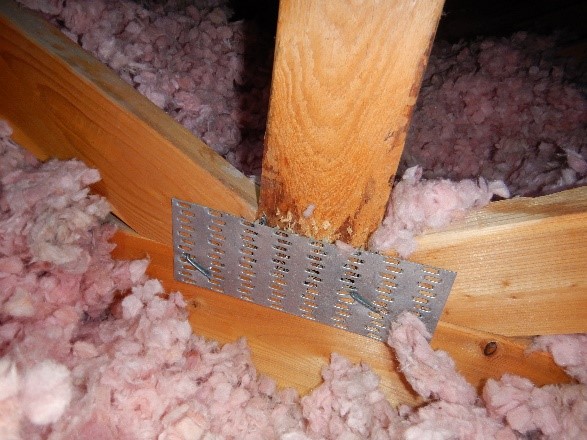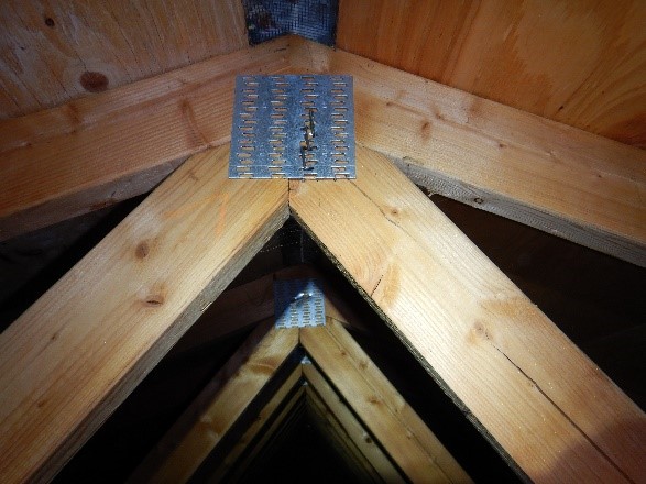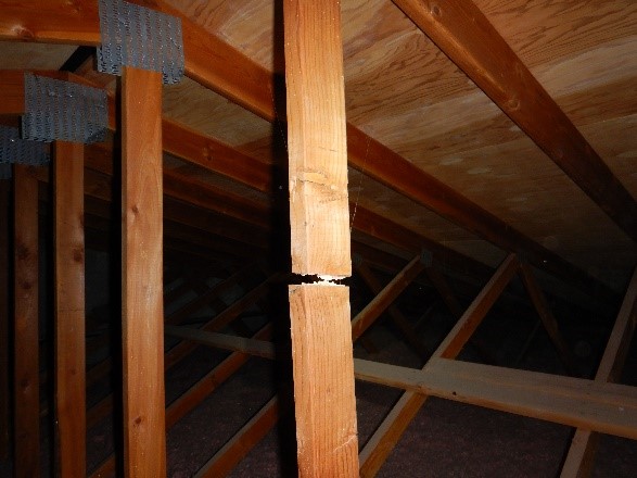 The headend equipment buildings ranged in size from approximately 1,100 SF minimum to approximately 4,200 SF maximum. Typical construction generally consists of concrete masonry unit (CMU) structures that appears to be supported by a slabs on grade and conventional spread foundations. The roofs generally appear to consist of two layers of ½” plywood, one layer of roofing felt underlayment, and asphalt shingles. The roof structures are typically supported by dimensional lumber wood trusses at 2’-0” on center (OC). Deficiencies observed at these locations included tensile failures at truss plate connections, evidence of previous moisture intrusion, and partial truss plate backouts.